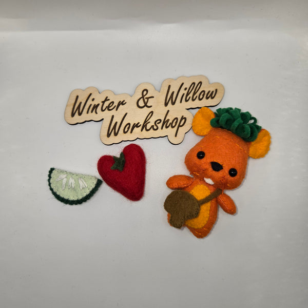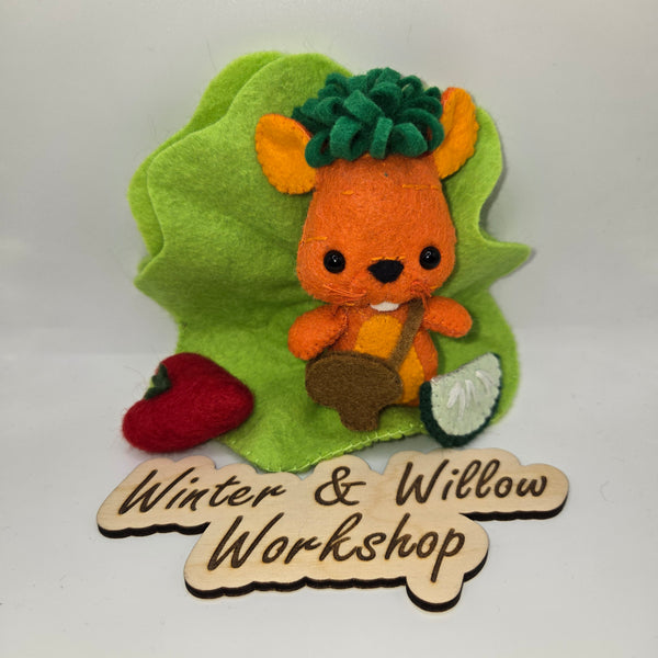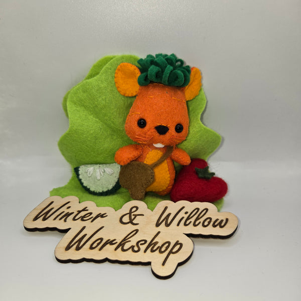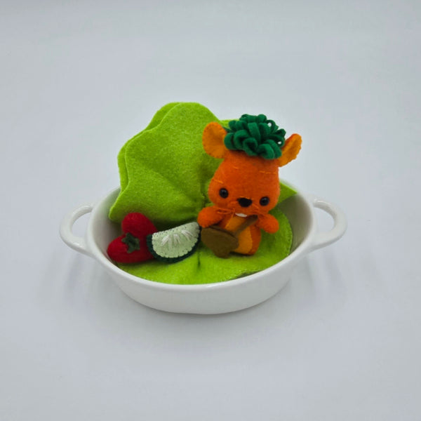 Meet the Manx Mouse, a tiny 3 inch felt carrot-themed companion ready to brighten your day. This playful little mouse comes with charming salad accessories, making it perfect for imaginative play or as a quirky desk buddy. Cute and quirky, it adds a dash of fun and whimsy wherever it goes!