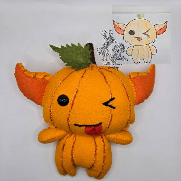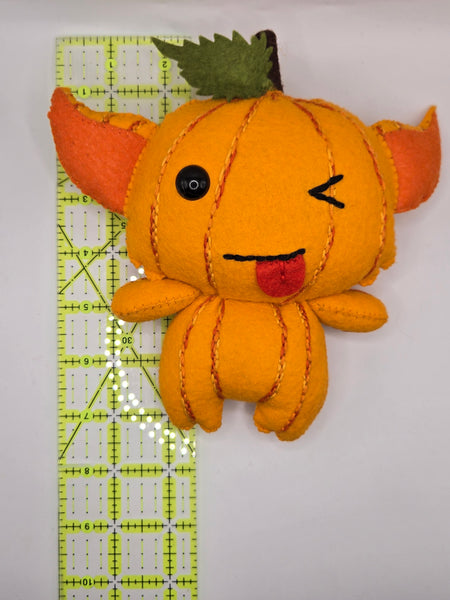 Find magic and imagination when playing with this Pumpkin Gremlin; handmade precisely with love and care. This adorable plush resembles a gremlin in pumpkin form giving a cute face!